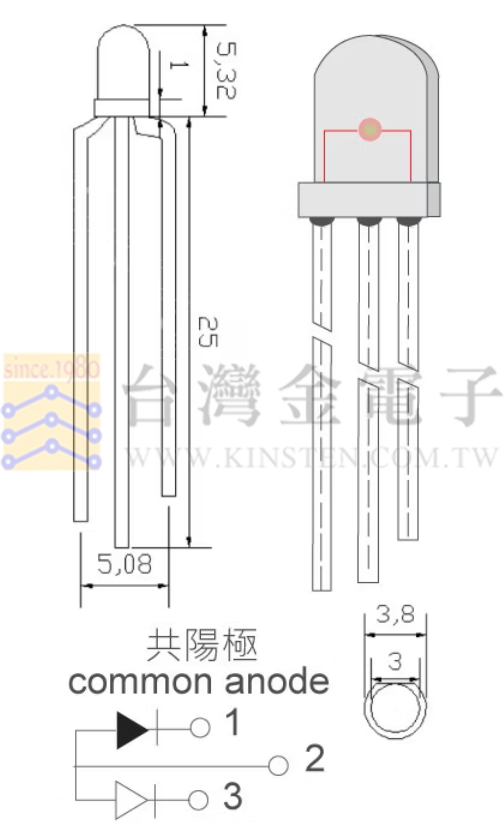 品名:LED 3mm 紅綠光 共陽級 30°直視角 透明膠面