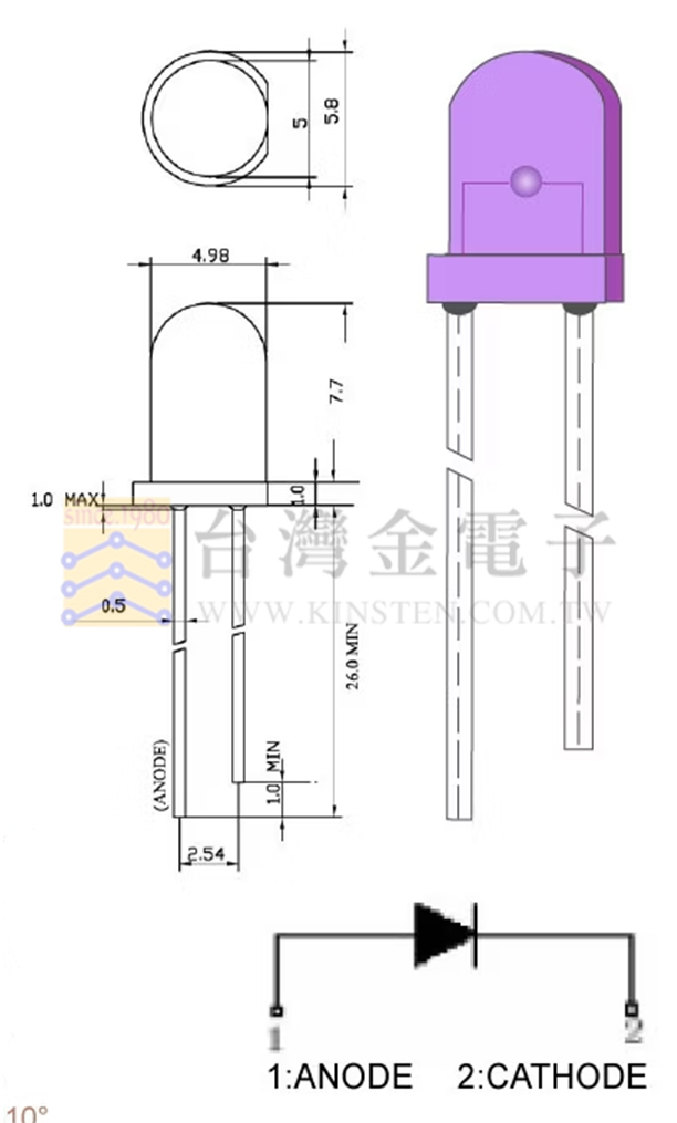 品名:LED 5mm 紫光 40°直視角 透明膠面