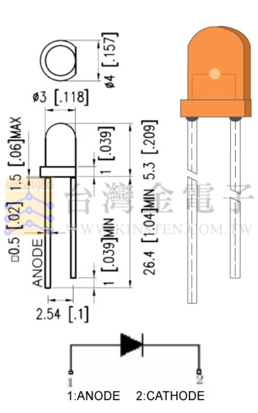 品名:LED 3mm 橙紅光 20°直視角 橙色膠面