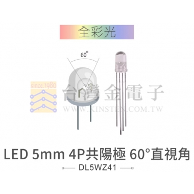 品名:LED 5mm 全彩光 4P 共陽極 60°直視角 透明膠面