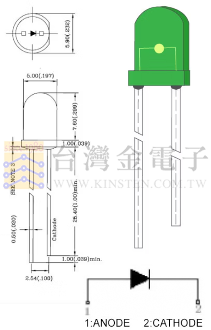 品名:LED 5mm 綠光 16°直視角 綠色膠面