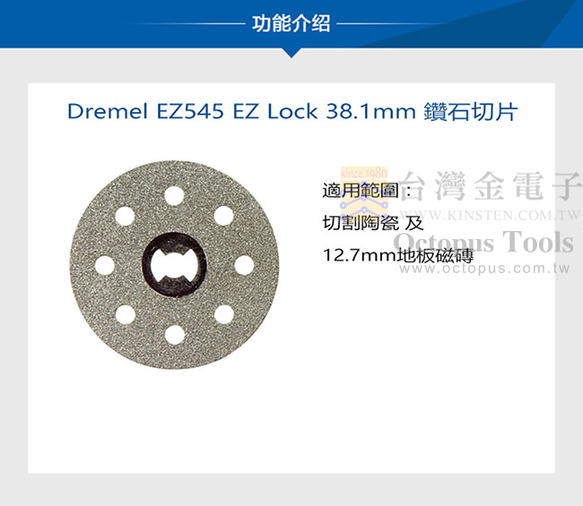 Dremel EZ545 38.1mm鑽石切片 ◆ 可切割12.7mm厚之地板磁磚,並可切割陶瓷。 ◆ 筆直切割不製造大量粉塵。 ◆ 容易安裝,可搭配Dremel獨家系統 EZ402 EZ Lock 軸柄使用。 ◆ Dremel EZ Lock 系列讓配件更換更方便,只要三步驟─拉、轉、放。 ◆ 搭配EZ402 EZ Lock軸柄,可即裝即切!