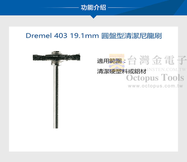 Dremel 403 19.1mm圓盤型清潔尼龍刷 ◆ 適用各種清潔和拋光,尤其是難以觸及的角落,例如開槽表面。 ◆ 簡易去毛刺、清潔和拋光,適用於銀器、珠寶和其他珍貴金屬,可搭配拋光膏使用。 ◆ 亦可用於清潔硬塑料或鋁材。 ◆ 耐磨尼龍刷頭壽命持久。