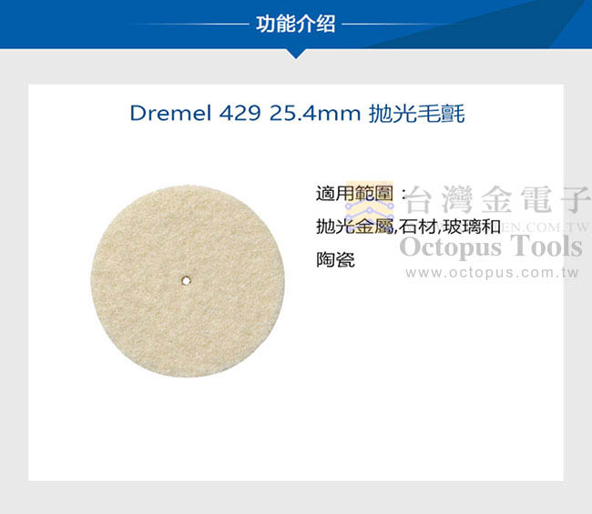 Dremel 429 25.4mm拋光毛氈 ◆ 適合金屬、石材、玻璃和陶瓷的拋光作業。 ◆ 每次使用,毛氈表面會自行更新。 ◆ 可搭配421拋光膏使用。 ◆ 需搭配401多功能軸柄。