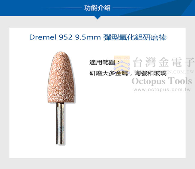 Dremel 952 9.5mm 彈型 氧化鋁研磨棒 ◆ 高品質的工業磨料, 適用大多數金屬,陶瓷和玻璃。 ◆ 適用於如金屬,鑄件,焊接點,鉚釘和鏽蝕處。 ◆ 亦適用於塑型,去毛刺和各種研磨,包括不銹鋼等多種材質。 ◆ 特別針對錐形表面作業而設計。 ◆ 3.2mm軸柄